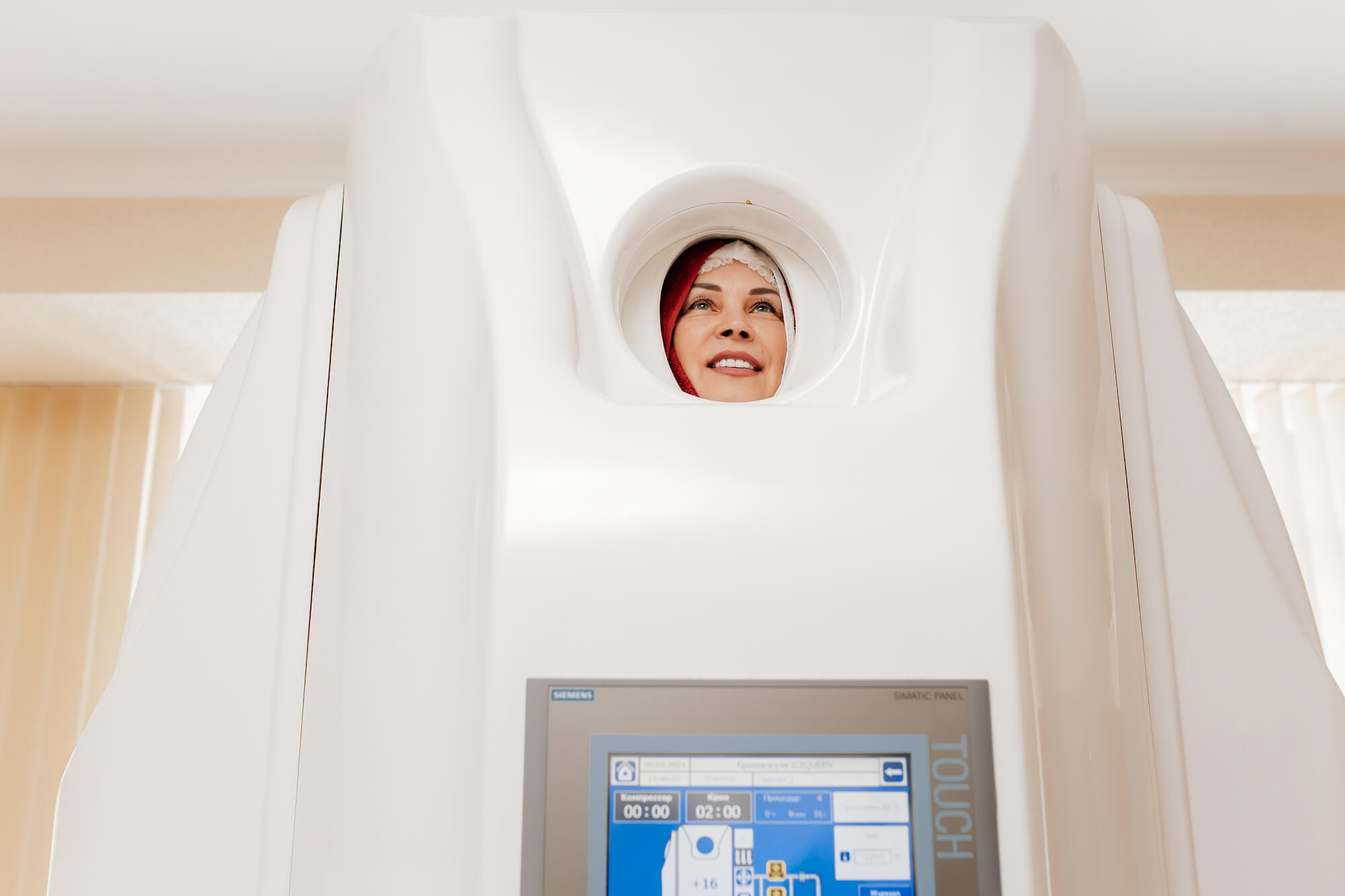 Общая криотерапия – это процедура, при которой на все тело кратковременно воздействуют пары жидкого азота, имеющие очень низкую температуру. Происходит это в специальной капсуле, открытой в области лица, поэтому человек продолжает дышать теплым окружающим воздухом. Тем временем поверхностные слои тела и конечностей подвергаются кратковременному воздействию низкой температуры. Холод не доходит до глубоких тканей, но мобилизирует силы организма.